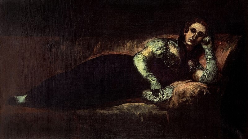 La retratada aquí también está recostada, lo hace sobre una suntuosa otomana de tapicería rojiza. Va elegantemente vestida y arreglada. Lleva un vestido compuesto de falda negra y corpiño blanco, chapines en los pies, mantilla negra en la cabeza y largos guantes blancos hasta el codo. Reposa su cabeza sobre el brazo, y se apoya en los acolchados cojines del diván. Su rostro es serio, pensativo, y la mirada profunda. El fondo es oscuro y neutro.